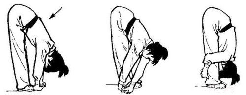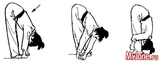 Примите такое исходное положение: станьте ровно, выпрямив спину, и поставьте ноги на ширину плеч. Теперь подымите вверх руки и переплетите пальцы. Начните медленные наклоны (как будто рубите дрова). Количество повторений: от восьми до пятнадцати раз. Данное упражнение тренирует сосуды головного мозга и сердечной системы.
