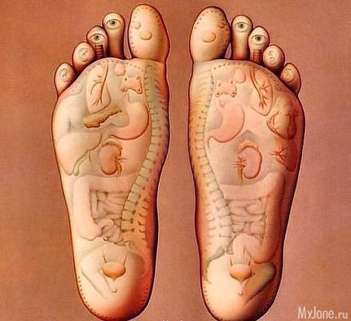 Найдите на стопе «позвоночник». Сядьте на пол со скрещенными ногами. Возьмите в руки любую стопу. Линия между пяткой и большим пальцем на внутреннем "ребре" - проекция позвоночника. Визуально разделите эту линию на части: крестец, поясница, грудной и шейный отдел. Большим пальцем с усилием потрите эту линию в направлении от пятки к носку. Если в позвоночнике есть проблемы, вы найдете здесь их отражение. Они ощущаются как болезненные и жесткие точки. Массируя их, вы не воздействуете на позвоночник напрямую. Вы делаете еще лучше: вы расслабляете те нервные окончания, которые создают напряжение.