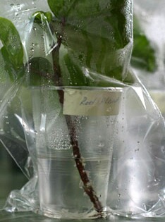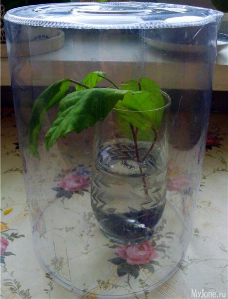 Ставим черенки в воду на укоренение, сверху накрываем тепличкой.