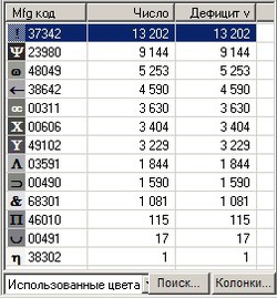 4. Эта база данных будет интегрирована с главной программой создания схем "Бисер и мулине с MyJane". Список цветов палитры главной программы будет иметь столбец "Дефицит", показывающий сколько бусин не хватает, примерно так, как изображено на рисунке. При этом все строчки цветов "в дефиците" будут как-то выделены, например подсвечены желтым цветом.