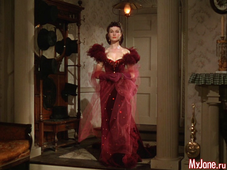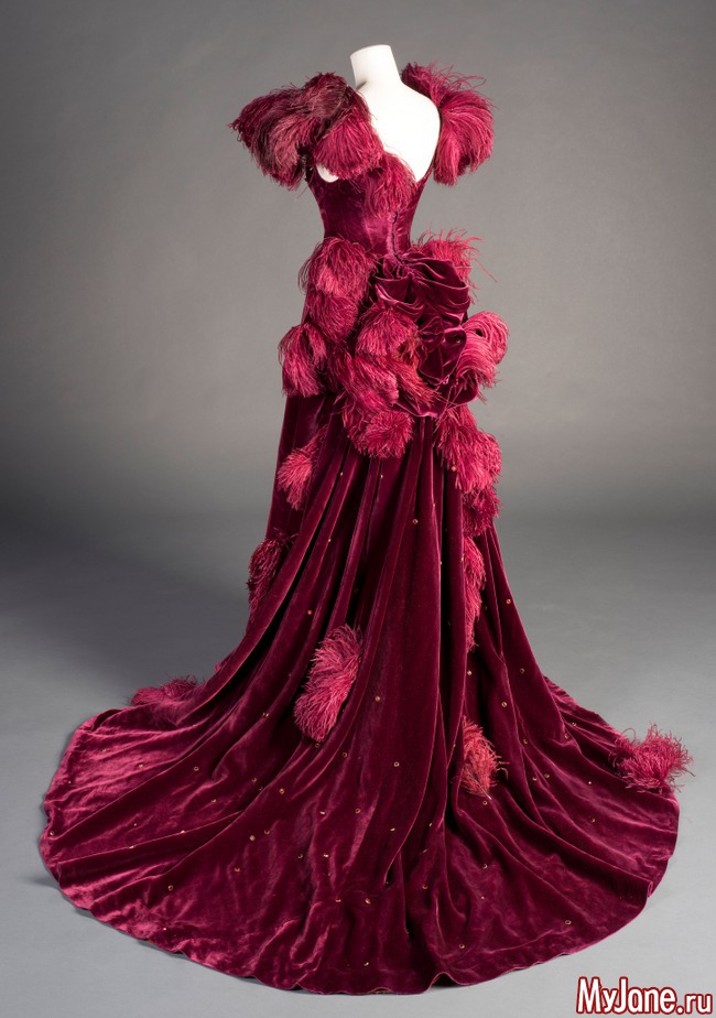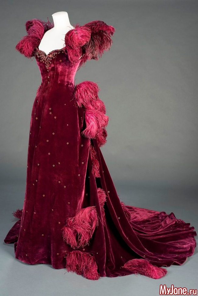 Этот экстравагантный бархатный наряд по всей длине был украшен страусиными перьями, спускавшимися вниз от лифа по юбке, а также крупными рубинами. Дополнением к нему стали длинные шелковые перчатки и воздушная накидка из тафты в тон.