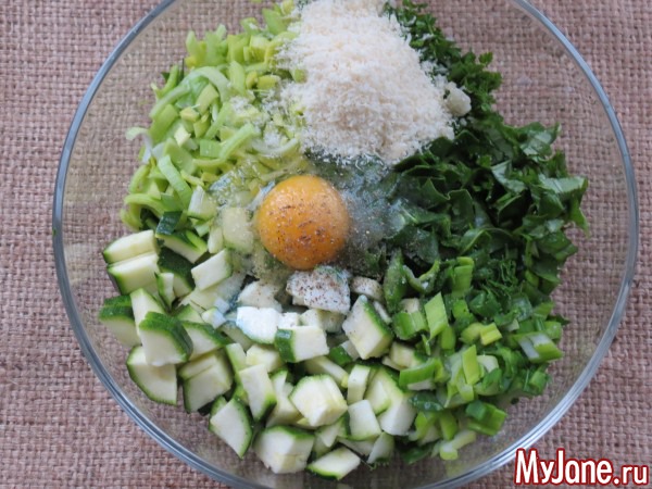 мелко нарезать мангольд / шпинат /, лук-порей, цукину, петрушку, базилик.