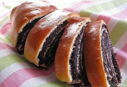 10. Стол присыпаем мукой и раскатываем тесто в пласт размером 30 на 20 см. Разрезаем вдоль на 2 части. Выкладываем маковую начинку оставляя по 2 см со всех сторон.