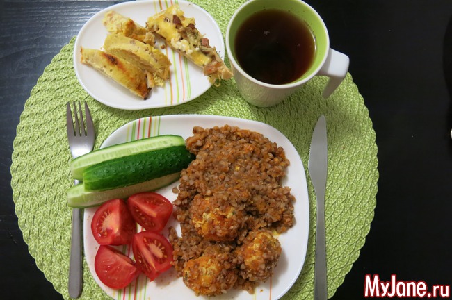 гречка, фрикадельки куриные с тыквой, огурец, помидор, запеканка, кусочек домашней пиццы, чай