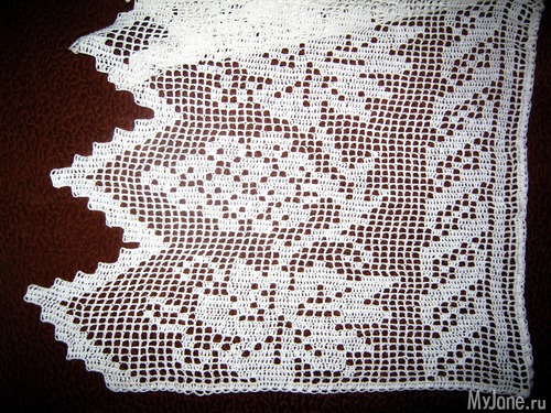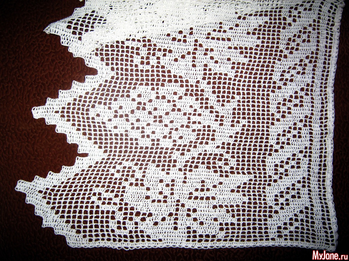 Вязание филейное крючком. Вязала одним полотном слева направо, если на занавеску смотреть. Вот как схема лежит, так и вязала.