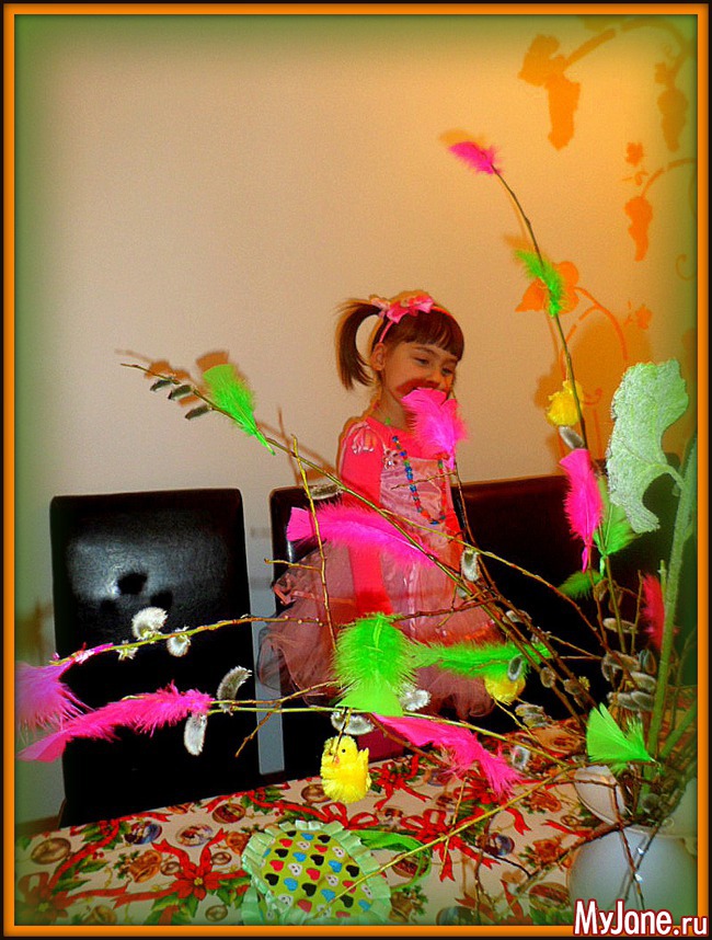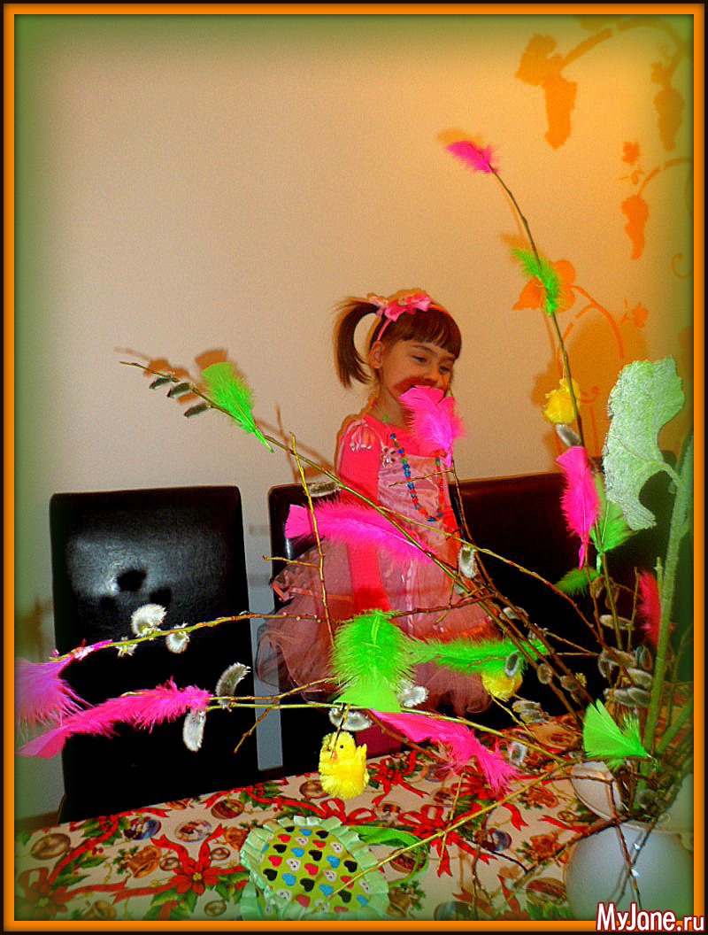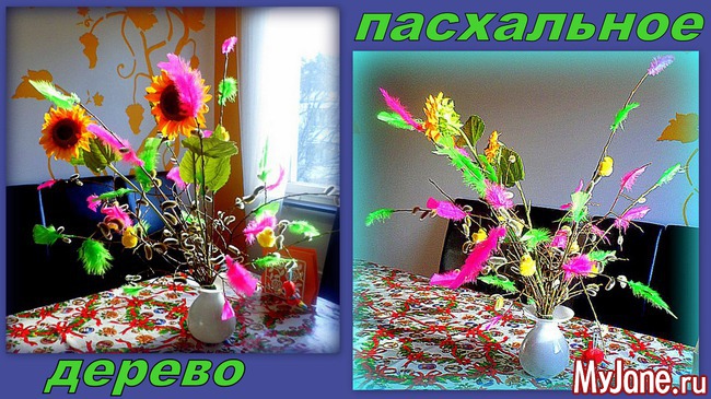 Чаще всего эти пёрышки развешиваются на кустарниках во дворе. А мы решили такой кустик украсить в доме... в этом году...