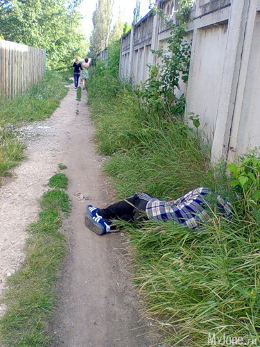 Присмотревшись, у дороги лежит пьяненький мужик.