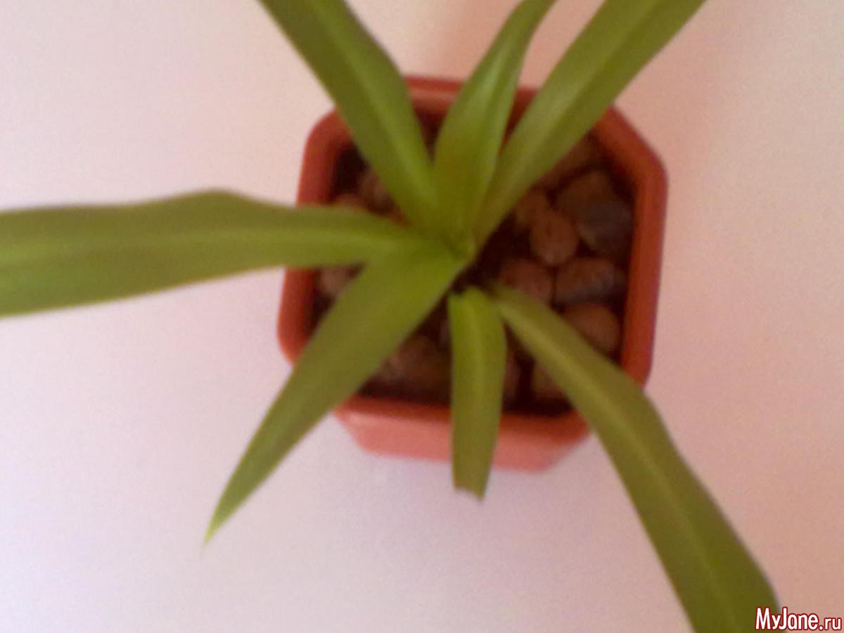 На фото - хлорофитум капский. В отличие от хлорофитума хохлатого с более декоративными полосатыми листьями отличается однотонной зеленой окраской. Зато листья более сочные и выразительные, а при хорошем освещении хлорофитум капский порадует вас обильным цветением. Цветочки на стрелках более яркие, чем у хлорофитума хохлатого, и по форме напоминают цветы жасмина.