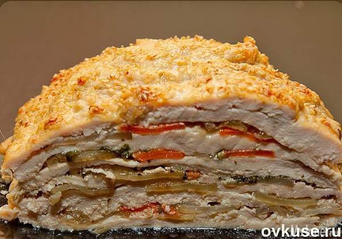 Вкуснейшее и оригинальнейшее блюдо - готовится из простых продуктов, а выглядит - как деликатес из шикарного ресторана. Можно делать порционно - одна куриная грудка на порцию, но мне кажется, что вкуснее и сочнее получается, когда всё готовится одним большим слоёным куском.