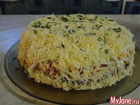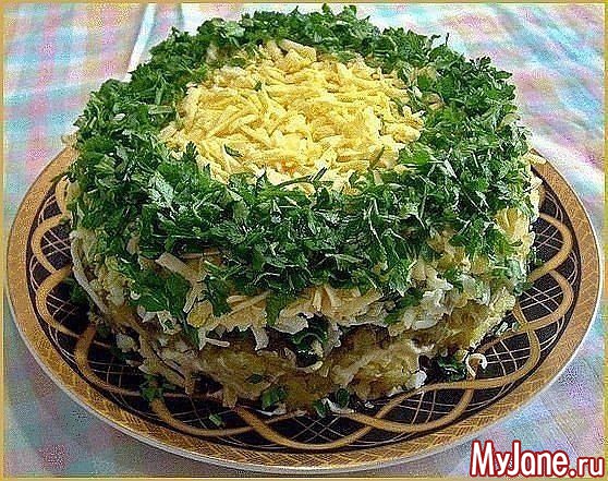 Салат выкладывается слоями : картофель, потом грибы, майонезная сетка, курица кусочками, лук, морковь, майонез, яйца, сыр, майонезная сетка.