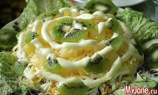 Салат украшаем кусочками киви и подаем на стол.