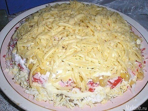 7. Следующий слой - сыр, натертый на крупной терке.