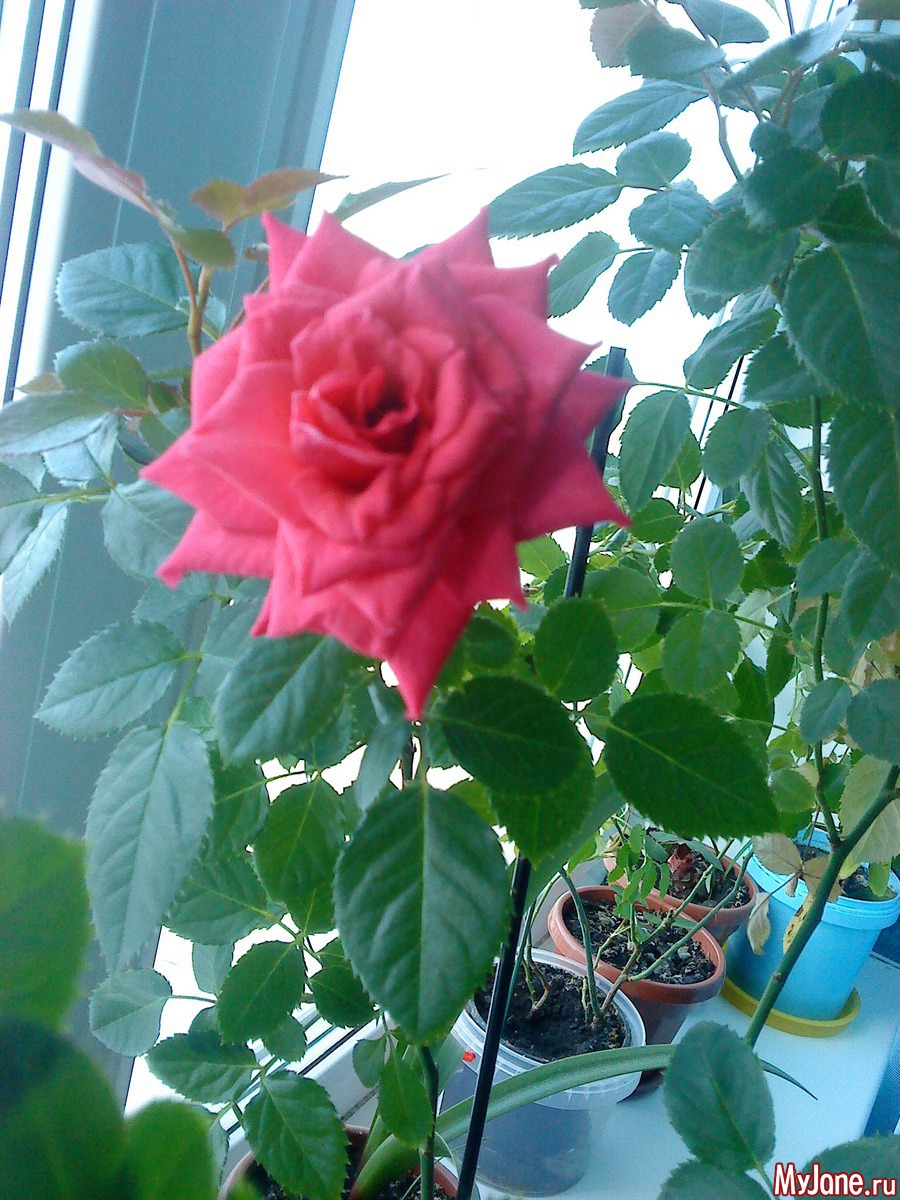 Осенью - после обрезки, пересадки и лета на свежем воздухе - роза процвела. Зимой уехала спать на холодную террасу. Весной, немного распушившись, она стала сушить веточки - в горшке обнаружился червячок. Пересадила в открытый грунт, там тоже ей не понравилось, просидела до осени, не нарастив ни одного нормального побега.