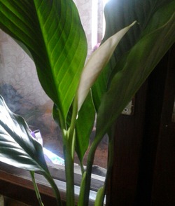 на день рождения, через год вместе с другом (который к тому времени неожиданно превратился уже в моего супруга) цветок переехал в мой дом, он разросся, похорошел, значительно увеличился в размерах - выпускал покрывала величиной с ладонь. И всё это несмотря на совершенно неправильный, я бы даже сказала издевательский уход.