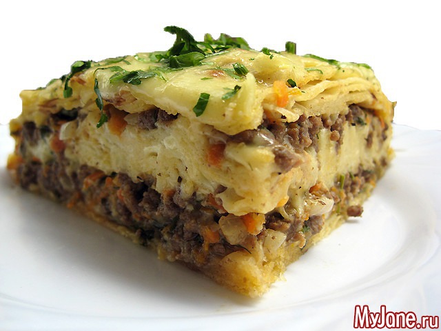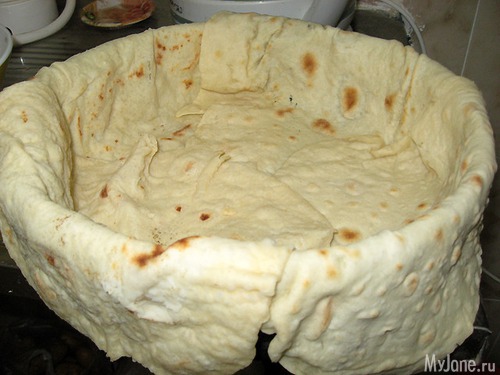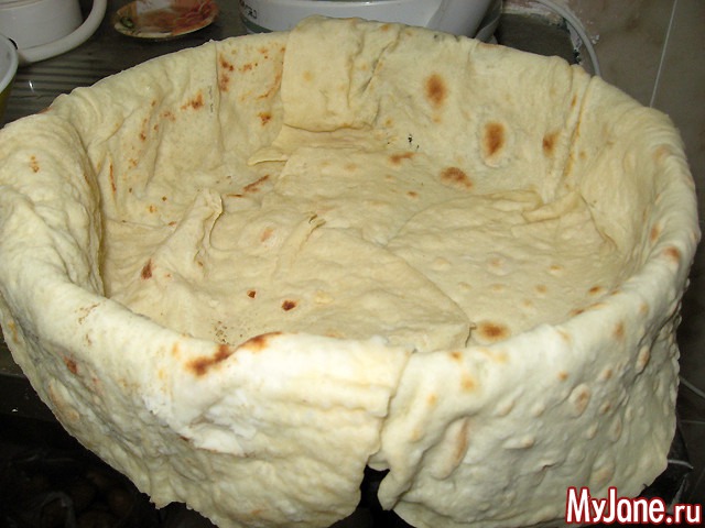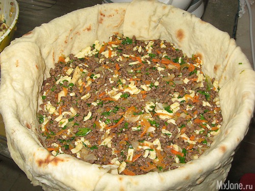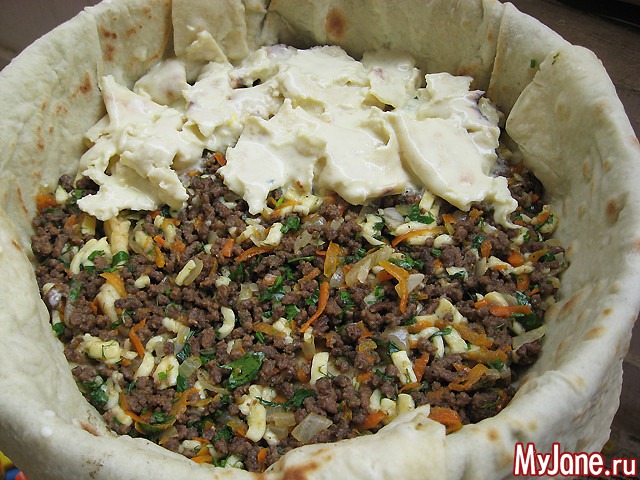 Сверху... на смятые кусочки лаваша... оставшийся фарш...