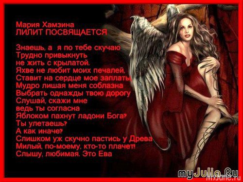 «Ночная Тень» – так переводится имя Лилит с древнееврейского языка. Загадочная, волнующая и неуловимая ночная фея, которая могла мгновенно превратиться ночную бестию при малейшем перепаде настроения. Поэтому семейная жизнь Адама сразу дала трещину. И очень скоро эта трещина стала непреодолимой пропастью между первыми людьми нашей планеты.