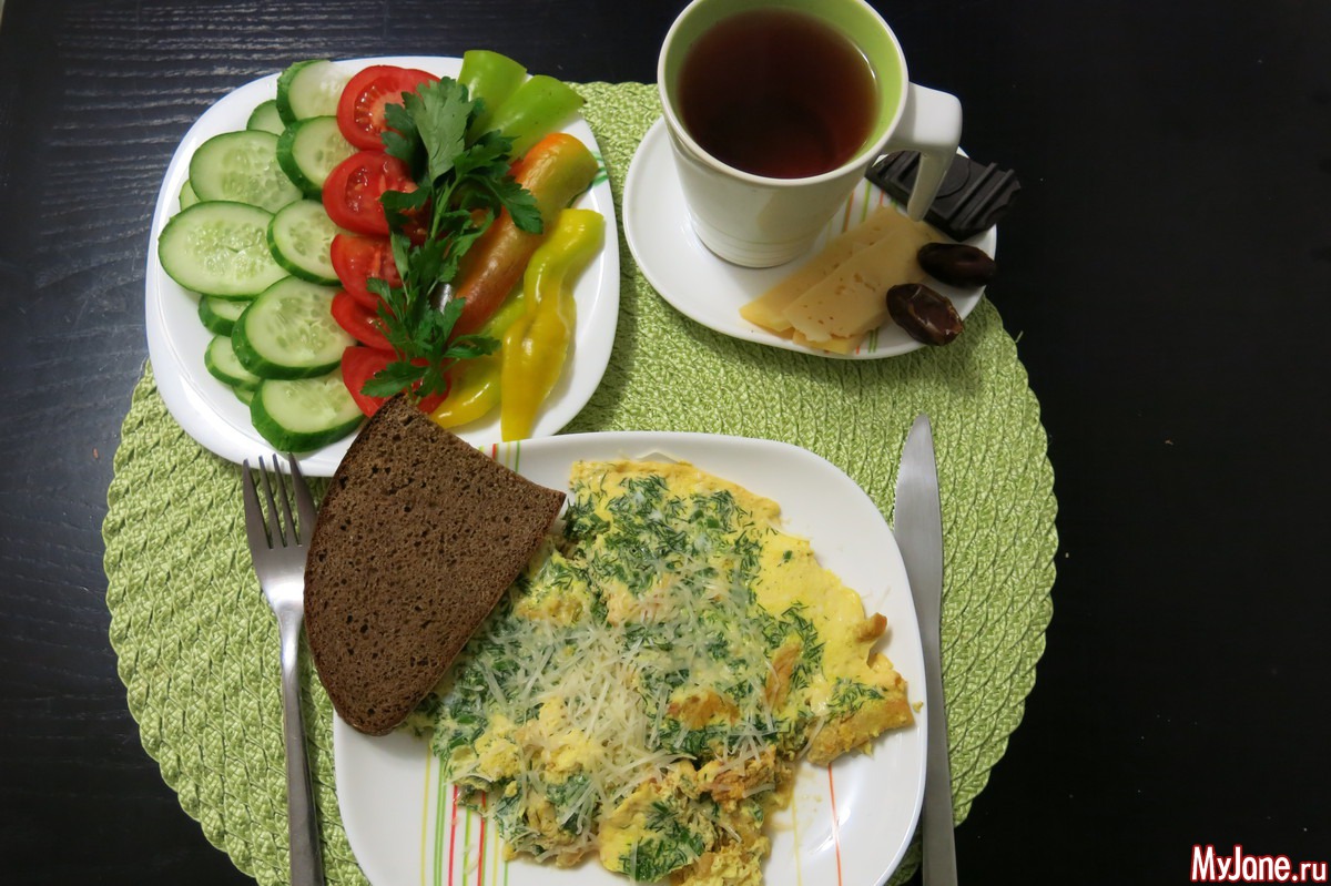 омлет с индейкой, овощи, кусочек хлеба, сыр, два финика, долька горького шоколада, чай