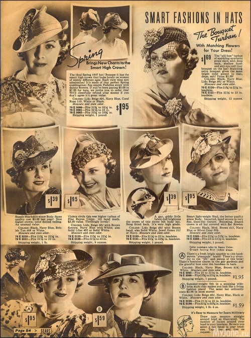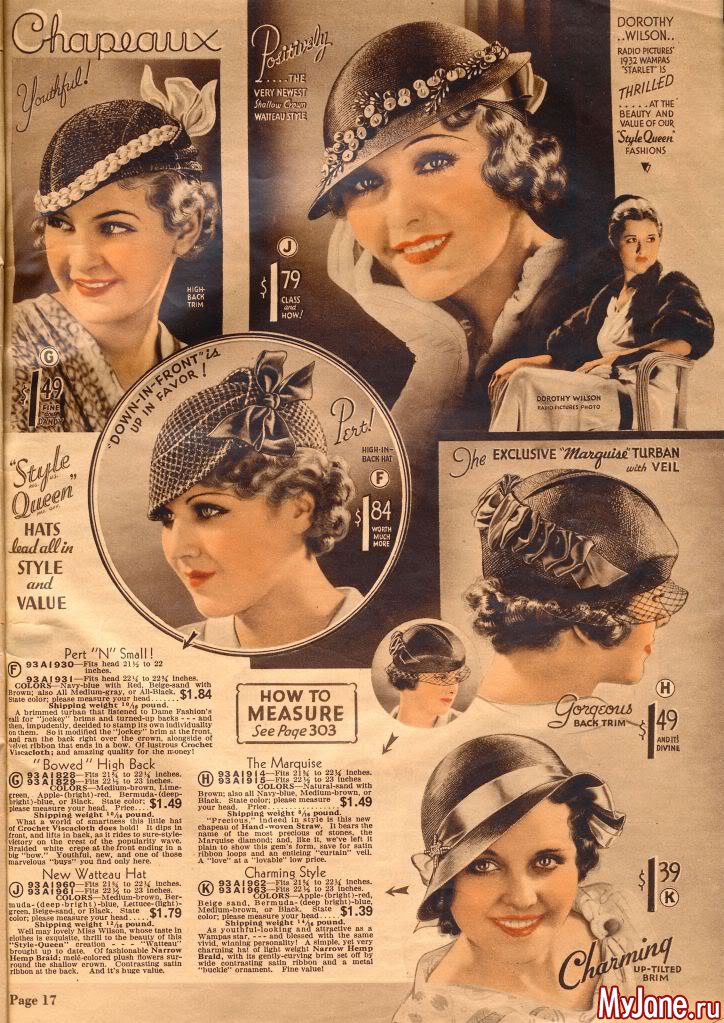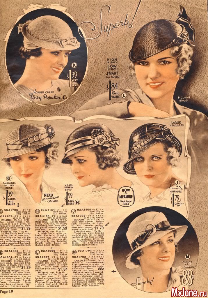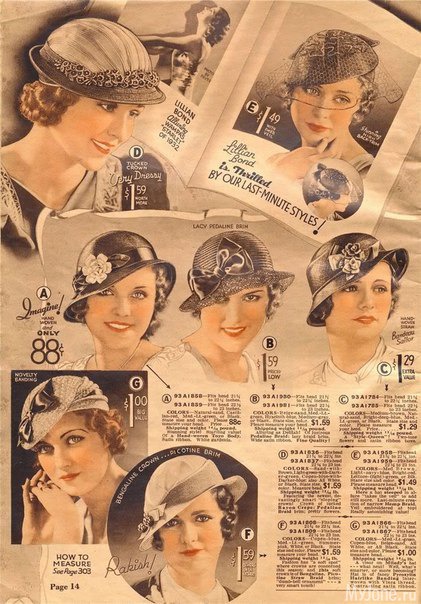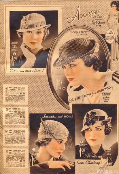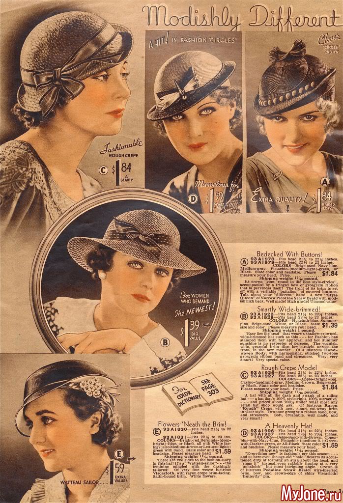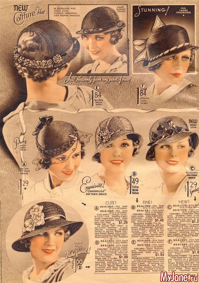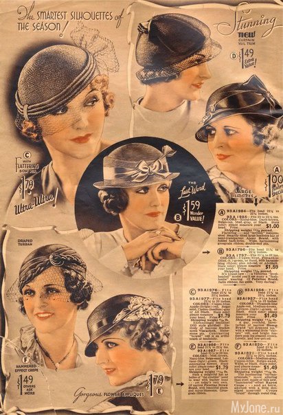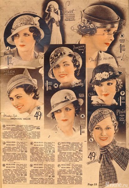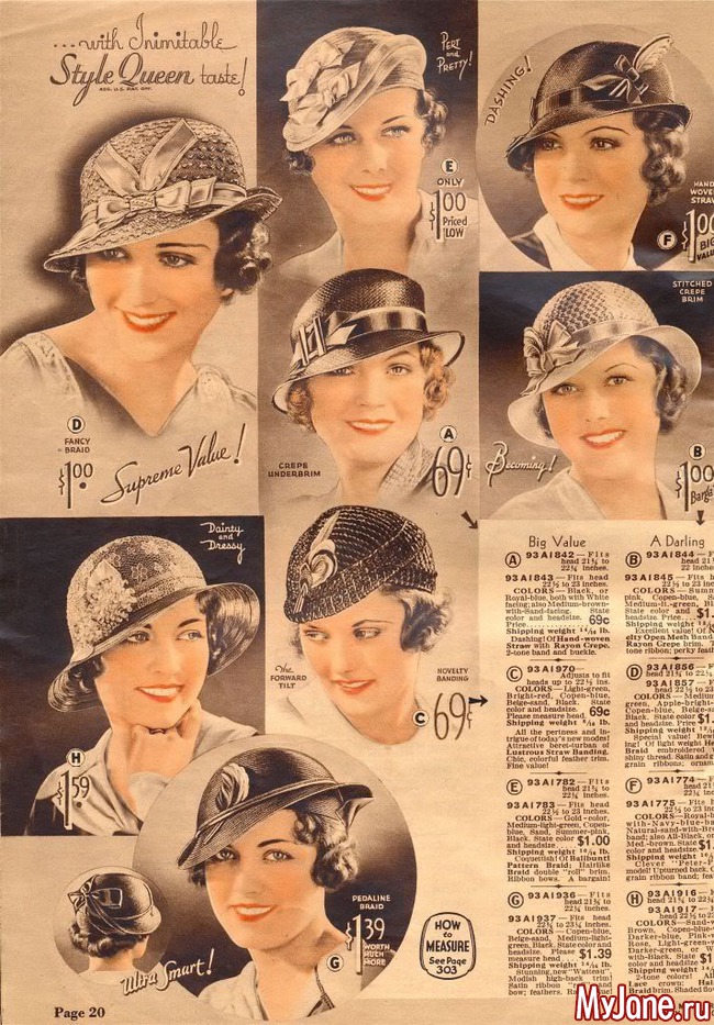 На страницах американского каталога Chicago Mail Order Catalog 1933 года представлены разнообразные фасоны шляпок, средняя стоимость которых в то время составляла 1$.