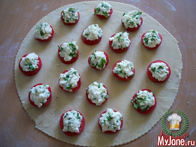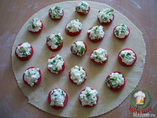 Разложить на тесто кружочки помидор не ближе чем 3 см друг от друга.