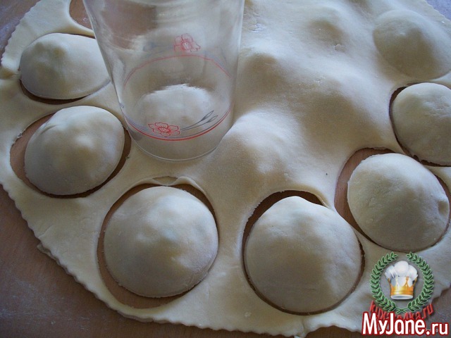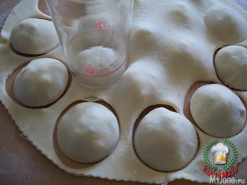Стаканом подходящего диаметра вырезать пирожки по контурам каждого кружочка помидора, так поступаем со всеми пирожками.