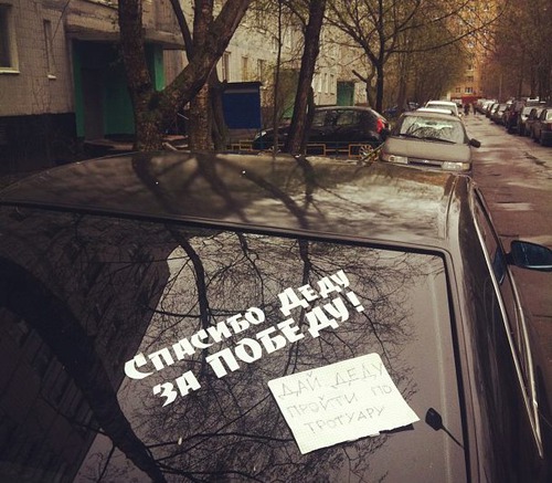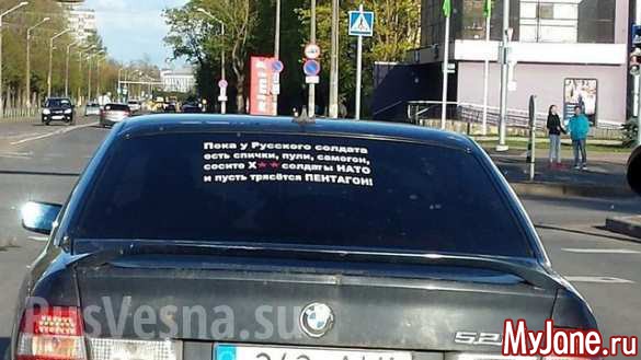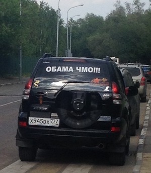 Все заднее стекло лозунгами расписано - и Обама ЧМО, и красная звезда, и георгиевская лента, и спасибо деду за победу