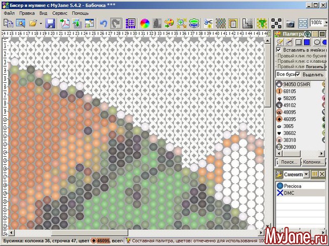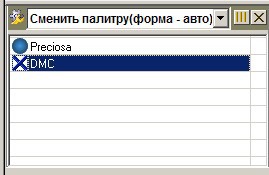 Теперь обе палитры - начальная бисерная Preciosa и добавленная палитра мулине DMC - отображены в нижнем окне правой панели. Выбираем палитру мулине DMC