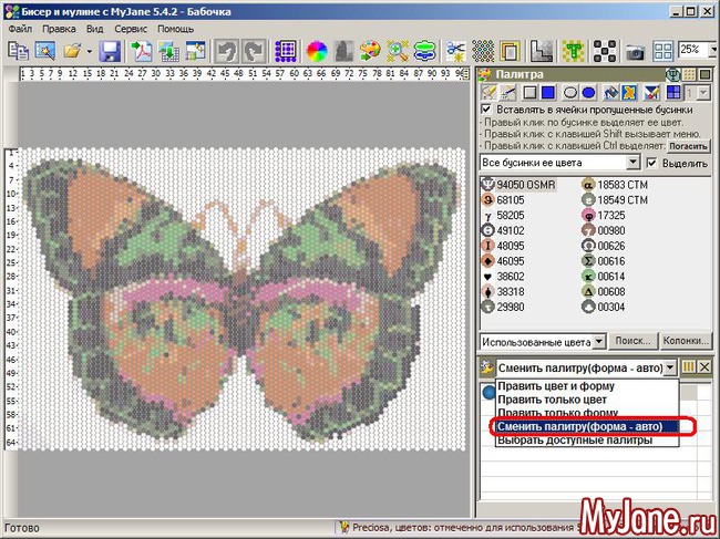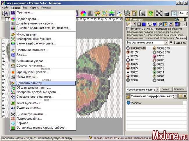 Приведем пример. У нас есть дизайн бисером "Бабочка", выберем команду меню Правка\Добавить палитру