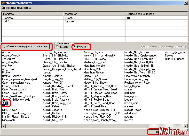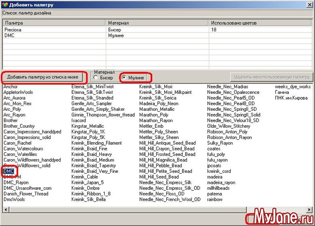 В появившемся окне выбираем материал Мулине и палитру DMC, нажимаем кнопки Добавить палитру из списка ниже и OK