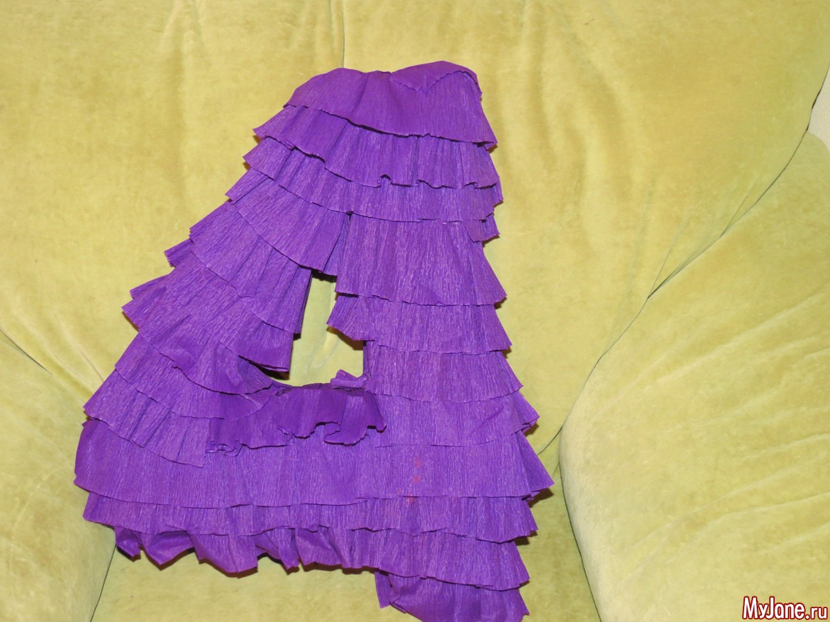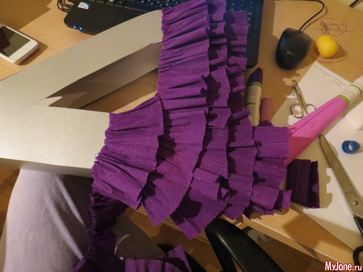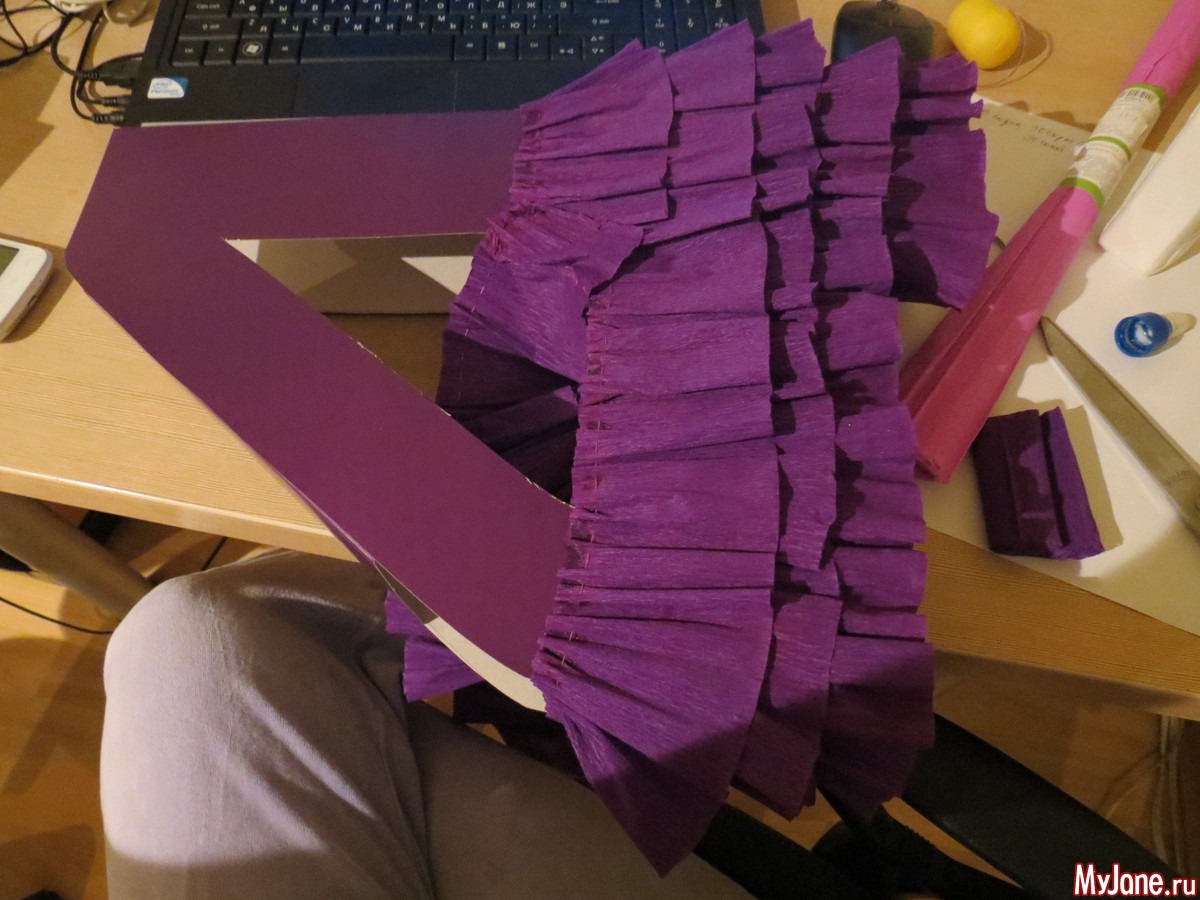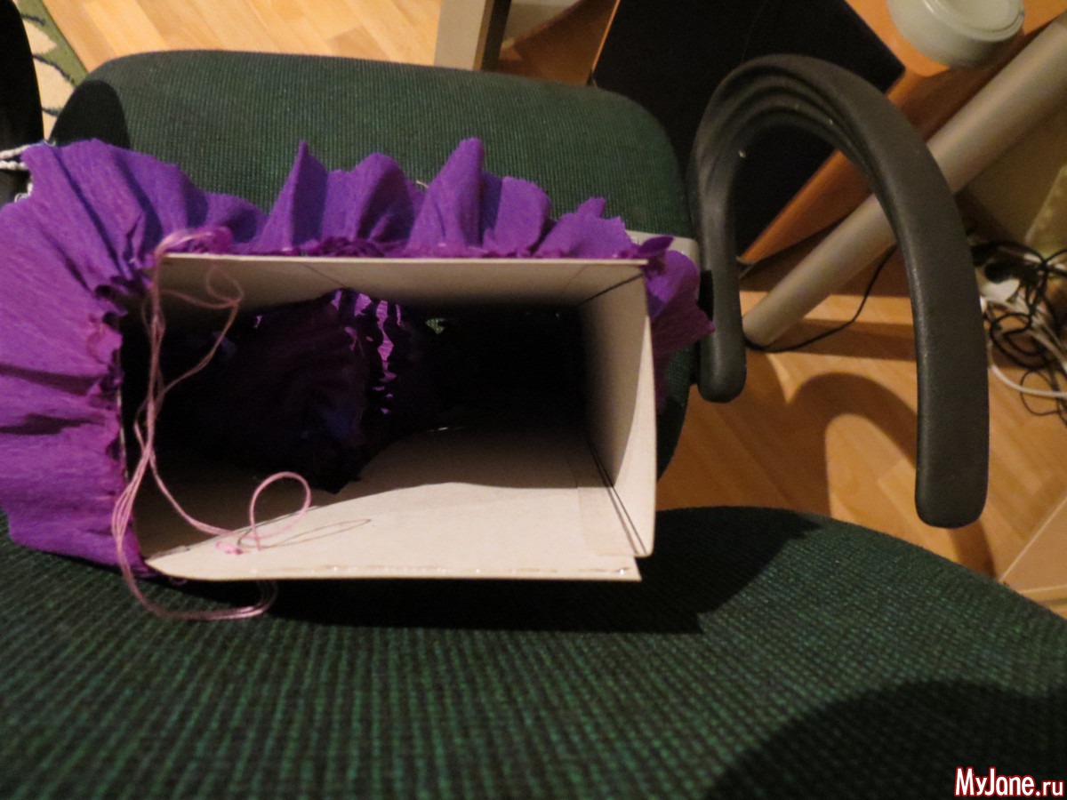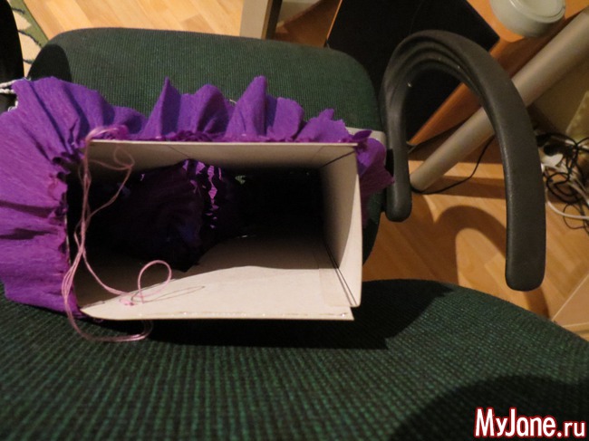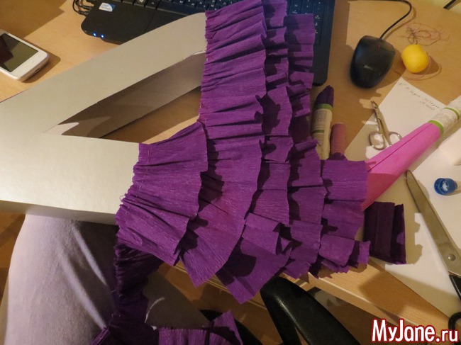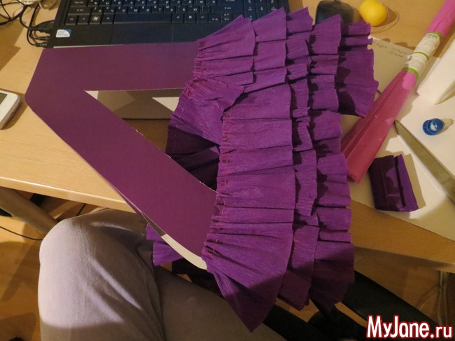 и начала обклеивать полосками гофрированной бумаги, предварительно нанизав бумагу на нитку и присобрав (если бумага не красивого цвета, то эту картонную заготовку нужно бы покрасить в тон оборкам)