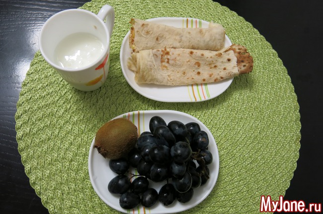 2 рулетика лаваша с сыром, кефир, виноград, киви