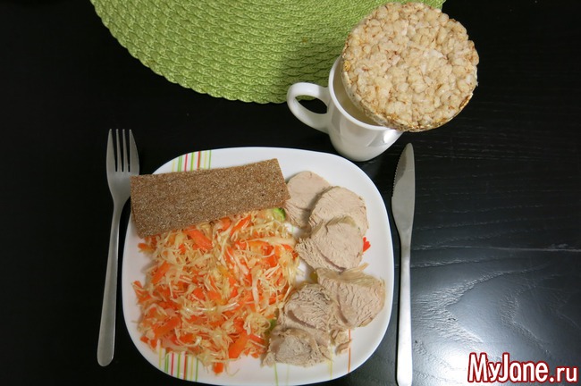 сылат (капуста+морковка+масло оливковое), индейка (белое мясо на пару), два криспа, кефир, хлебец