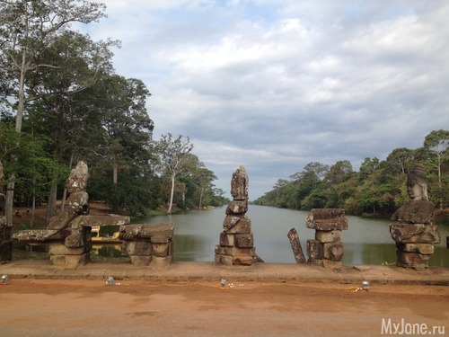 Дамбы украшены каменным фигурами, справа находятся изображения богов, а слева – демонов. Эти мифологические фигуры охраняют все пять входов в город.