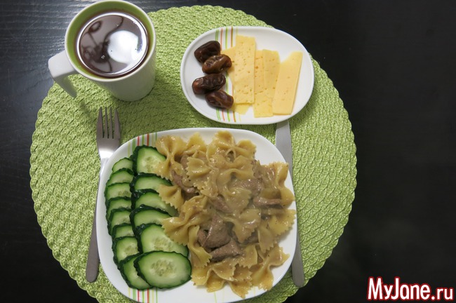 макароны с подливкой из печенки, огурец, сыр, 4 финика, чай