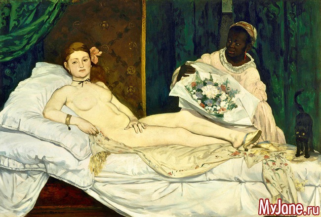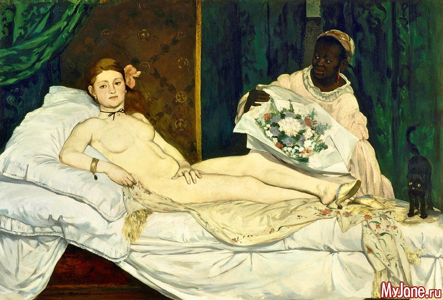 Казалось бы, что отличало обнаженную девушку с картины Мане от «Венер», «Сусанн», «Купальщиц» и прочих ню, которые в середине XIX века присутствовали на каждой выставке? Но его Олимпия не была ни персонажем мифа или древней истории, ни аллегорией, ни отвлеченным примером женской красоты. Олимпией звали куртизанку, героиню романа и драмы Александра Дюма-сына «Дама с камелиями»; это эффектное античное имя служило «творческим псевдонимом» многим дорогим парижским проституткам. Лежащая на приготовленной постели девушка с картины Мане смотрит прямо на зрителя откровенным и немного циничным взглядом — как на только что вошедшего клиента, и это злило респектабельных (по крайней мере, на публике) столичных буржуа.