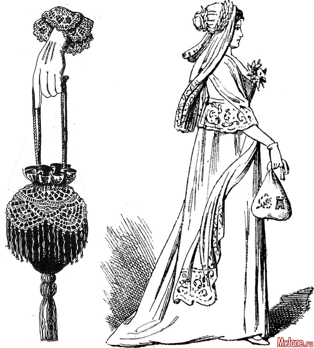 Ридикюль - женская сумочка, часто шелковая, в виде мешочка или корзинки с длинным шнурком, которую носят в руке или на запястье.
