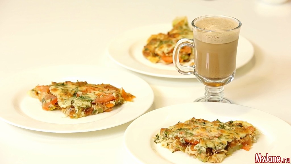 2. Смазать противень или большую сковороду маслом, уложить в два слоя кольца кабачков одно к другому, прикрыть их слоем из обжаренной и нарезанной тонко поперек грудки курицы. Уложить на мясо слой из пассерованных лука с морковью, далее помидоры, закончить чесночным слоем.