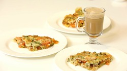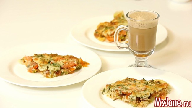 3. Верх диетической пиццы из кабачка с куриным филе присыпать сыром, залить смешанным яйцом с молоком, присыпать зеленью, отправить в духовку, держать до расплавления сыра.