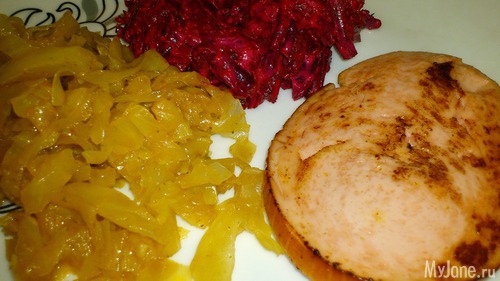 А это мясо жаренное....Свекольный салат и тушеная в мульте капуста. Все Не мое. Я же не готовлю. Посему выставляю кулинарные творения мого мущины)))) Я только ем)))