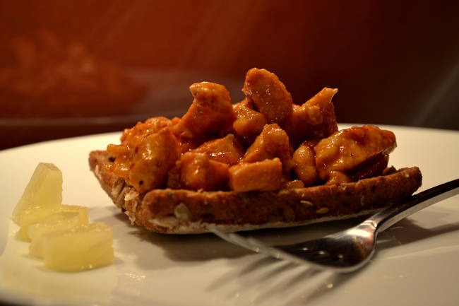 Курофиле порезанное,обжаренное с анансовым сиропом, лук-чеснок, 2 ложки майонеза(дадада!) и сухая паприка сладкая. Мелко порезанные кусочки ананаса. Вкусноооо.....Импровизация)))