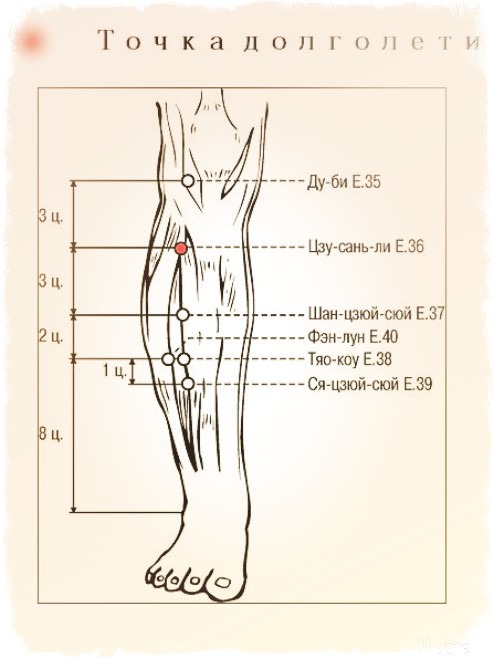 Поэтому активизация «сан-ри» значительно улучшает их работу. Воздействуя на точку «божественного долголетия», мы нормализуем обменные процессы, помогаем сердечно-сосудистой системе и повышаем в целом возможности организма приспосабливаться к изменениям в окружающей среде.