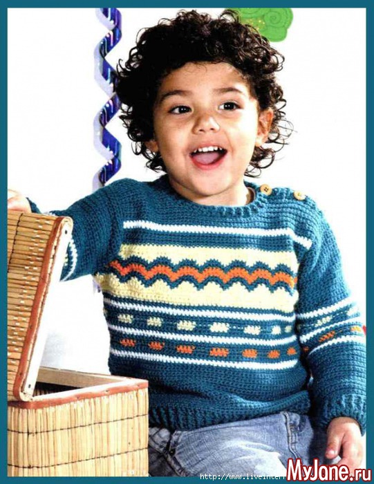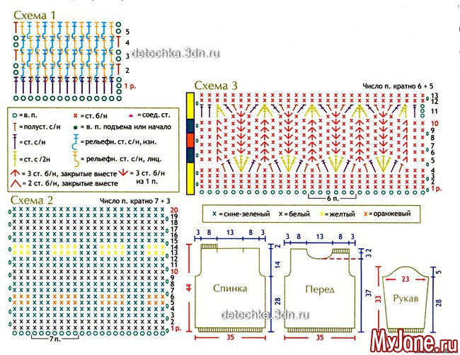 Нитью сине-зеленого цвета набрать цепочку из 66 в. п., вязать 4 р. по схеме 1, 20 р. ст. б/н, 20 р. по схеме 2, 13 р. по схеме 3, убавив в 1-м р. 1 п. = 65 п. Затем связать ст. б/н 5 р. нитью сине-зеленого цвета, прибавив в 1-м р. 1 п. = 66 п., 2 р. нитью белого цвета и продолжить нитью сине-зеленого цвета. Одновременно на высоте 28 см от начала вязания закрыть для пройм с обеих сторон в каждом р. 3 п., 2 п. и 1 п. = 54 п. Через 14 см от начала пройм продолжить вязание 15 п. левого плеча резинкой по схеме 1. Через 2 см, получив по 15 п. для каждого плеча и 24 п. для выреза горловины, закончить вязание.
