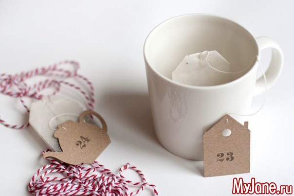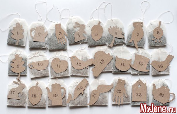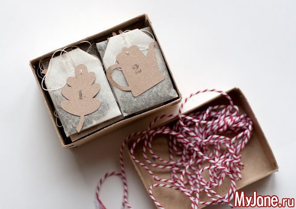 Попалась идея для рождественского календаря. Обычно в него кладут какие-то сладости и вкусности. А тут предлагается положить пакетики с чаем. Я бы еще выбрала для этого чаи разных сортов. Правда придется постараьтся поискать столько сортов чая. Дизайн упаковки тоже можно свой придумать.