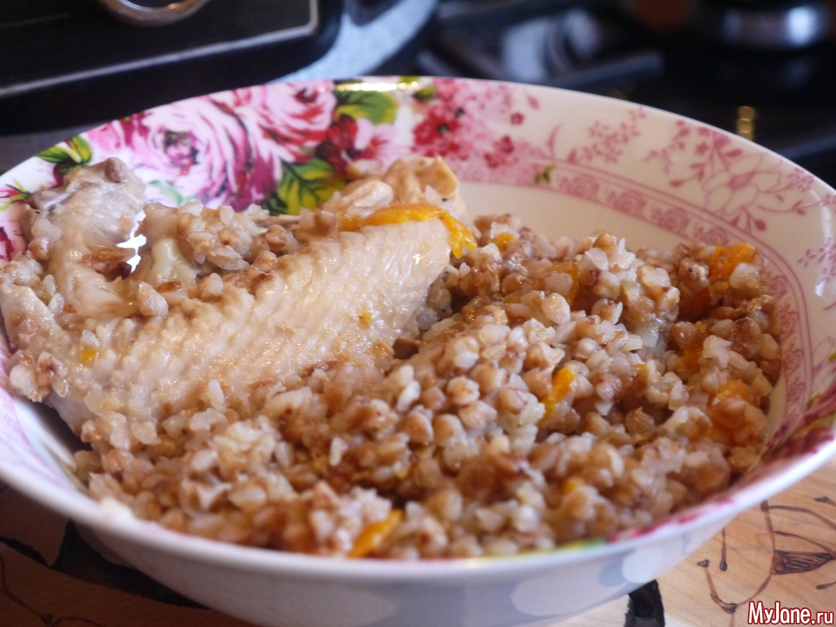 Гречечка в сметанке с лучком, морковочкой и крылышками