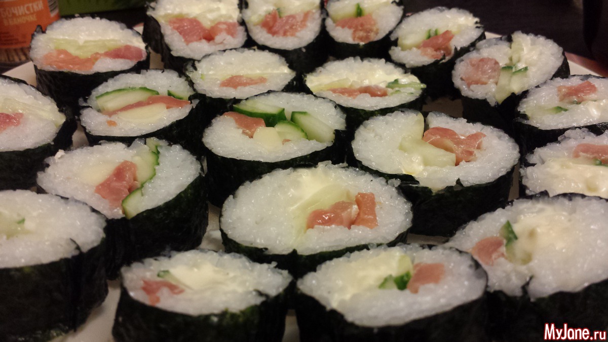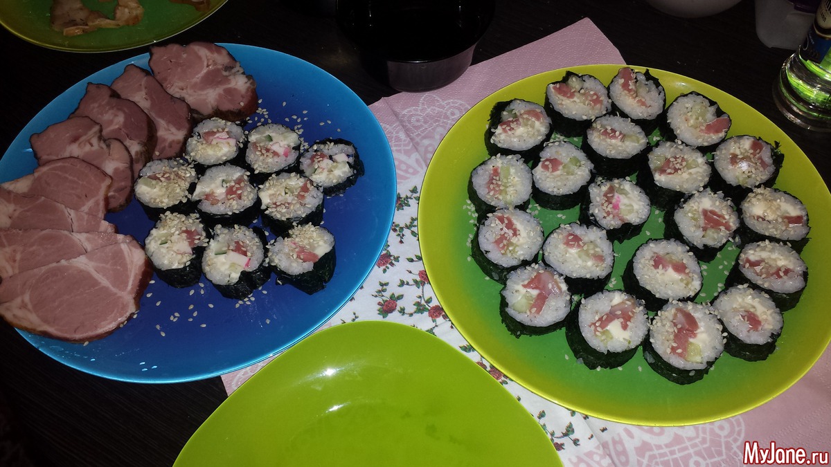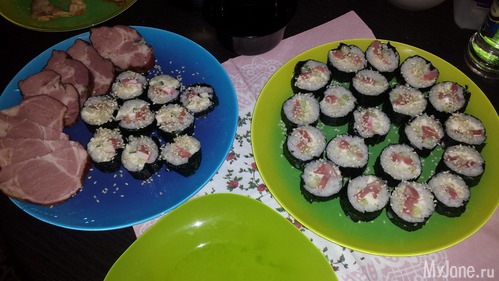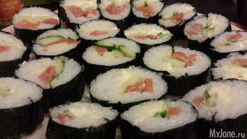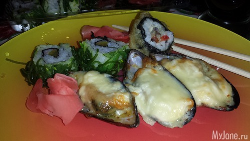 в этот раз сделала только с фунчозой, огурцом, морковкой и зеленью в заправке. К суши, чтоб не скучно было. И всё