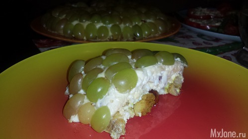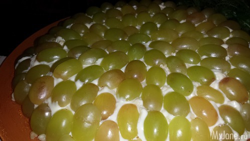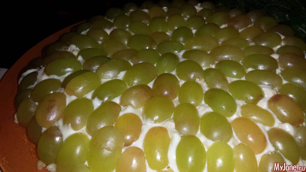 Верх - майонез и крупные виноградины, разрезанные пополам и уложенные плотненько.
