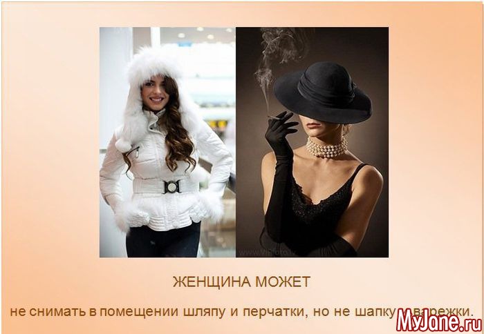 8. Женщина может не снимать в помещении шляпу и перчатки, но не шапку и варежки.