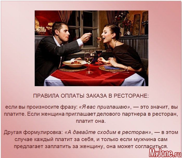 10. Правила оплаты заказа в ресторане: если вы произносите фразу «Я вас приглашаю», — это значит, вы платите. Если женщина приглашает делового партнера в ресторан, платит она. Другая формулировка: «А давайте сходим в ресторан», — в этом случае каждый платит за себя, и только если мужчина сам предлагает заплатить за женщину, она может согласиться.