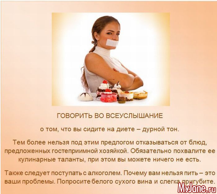 13. Говорить во всеуслышание о том, что вы сидите на диете — дурной тон. Тем более нельзя под этим предлогом отказываться от блюд, предложенных гостеприимной хозяйкой. Обязательно похвалите ее кулинарные таланты, при этом вы можете ничего не есть. Также следует поступать с алкоголем. Не стоит сообщать всем, почему вам нельзя пить.