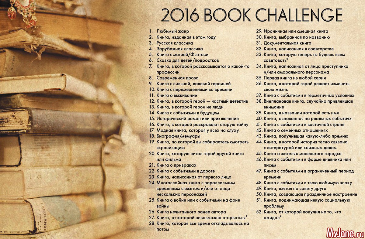 • За год надо прочитать 52 книги, подходящие по списку (предположительно по одной в неделю, но тут у кого как сложится). Читать можно как удобно — четко по списку или в свободном порядке.