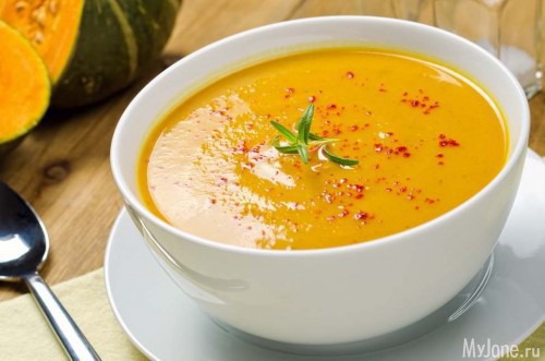 Перелить суп в блендер и пюрировать до получения однородной массы. Если нужно, добавить дополнительно воду или бульон, чтобы достичь желаемой консистенции. Перелить суп в кастрюлю. Подавать теплым, украсив кусочками яблок и засахаренными грецкими орехами.
